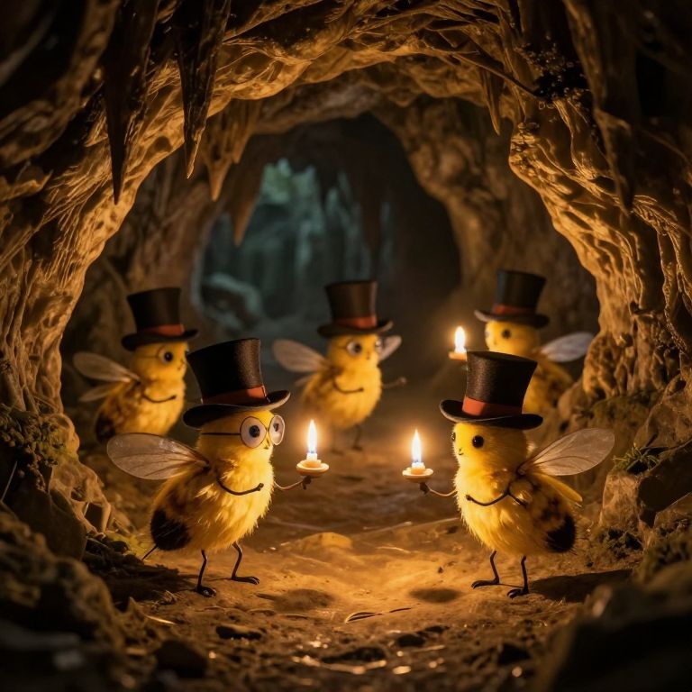 In a whimsical cavern illuminated by golden light, anthropomorphic fireflies adorned with top hats and monocles hold tiny candles, casting ethereal shadows while engaging in a surreal exploration of the unknown.