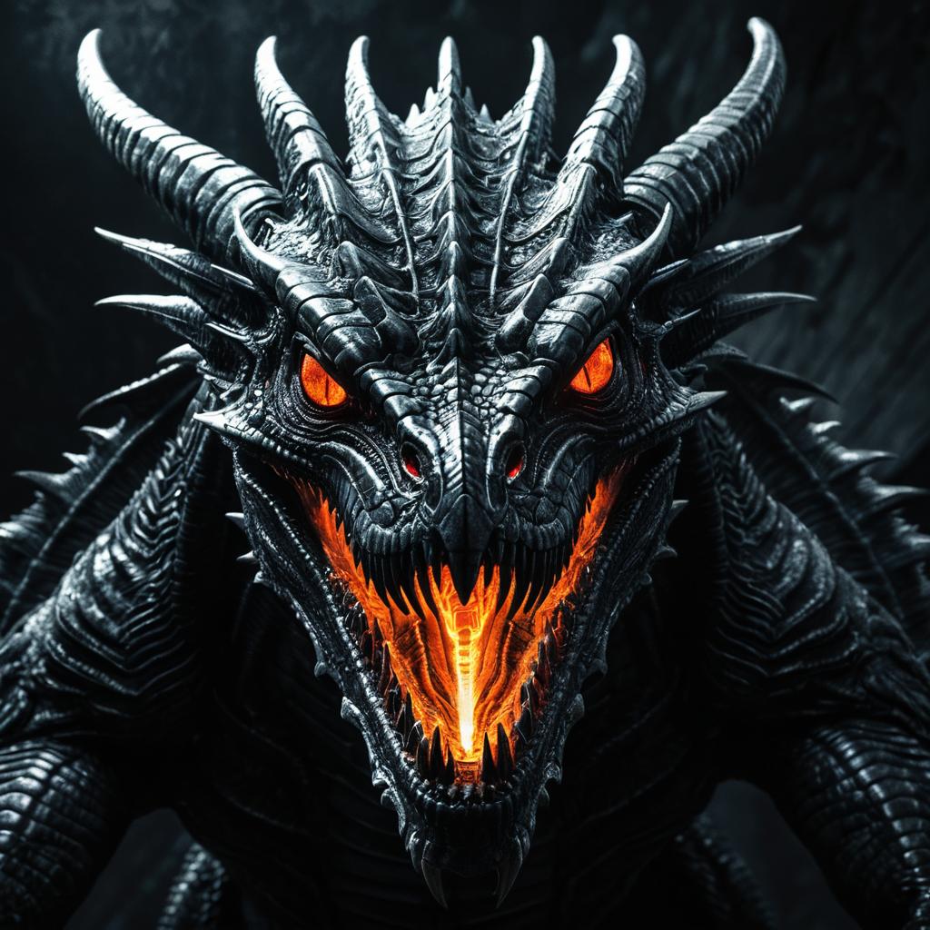 Close-up of an intricately detailed dark serpent with deformed and ragged scales, glowing amber eyes, and sharp fangs. The serpentine body is rendered in black-and-white tones with a haunting, biomechanical style inspired by H.R. Giger. The image features a menacing, gothic atmosphere with a textured, segmented body and ominous background.