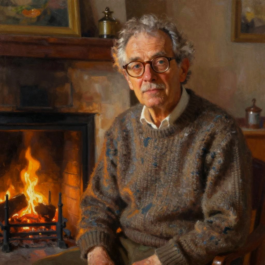 Backenbart style on an older gentleman wearing vintage glasses, graying hair, a cozy sweater, sitting by a rustic fireplace, warm ambiance, rich textures on face and hair, impressionist painting feel with vibrant brush strokes.