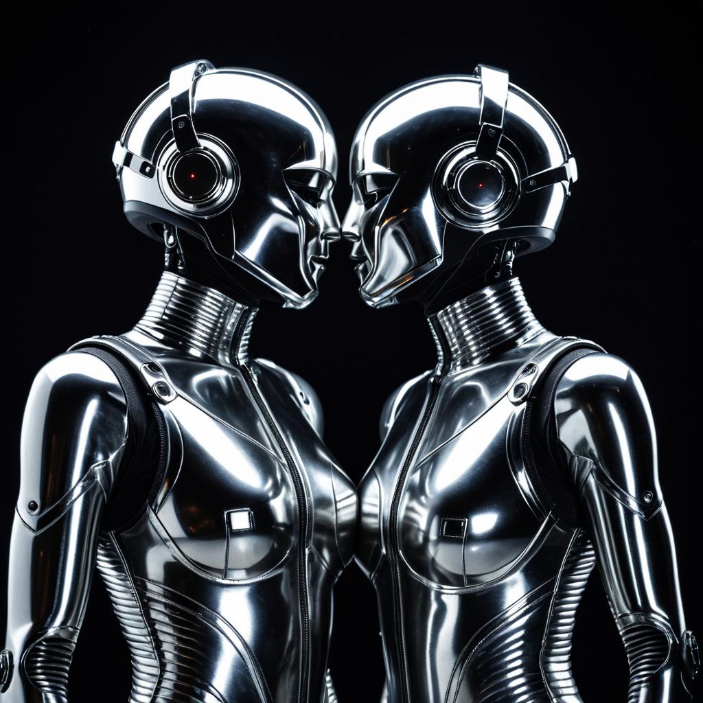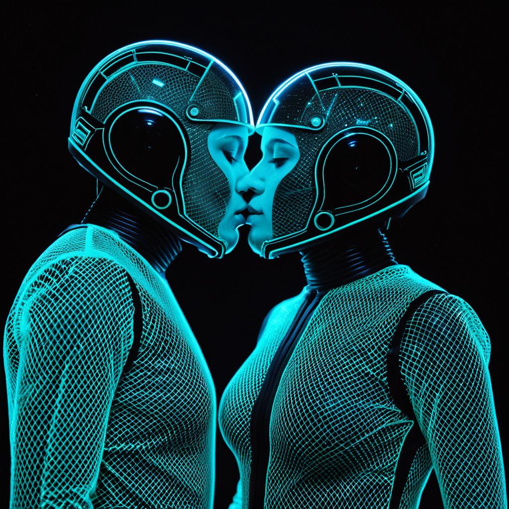 Portrait of two half-human, half-robot figures kissing, wearing glossy black exoskeleton suits with illuminated circuit patterns, in the style of James Gilleard, highly detailed