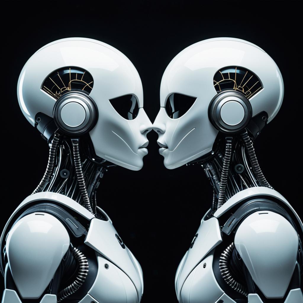 Portrait of two half-human, half-robot figures wearing glossy black exoskeleton suits with illuminated yellow circuit patterns, facing each other closely as if kissing. The image conveys a fusion of human and robotic elements with high detail and futuristic design.