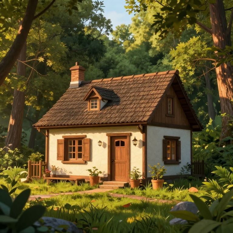 A cozy cottage nestled amidst a lush forest, illuminated by warm golden-hour lighting, exudes a serene and inviting ambiance, rendered in a detailed digital art style with vibrant colors and meticulous attention to natural textures.