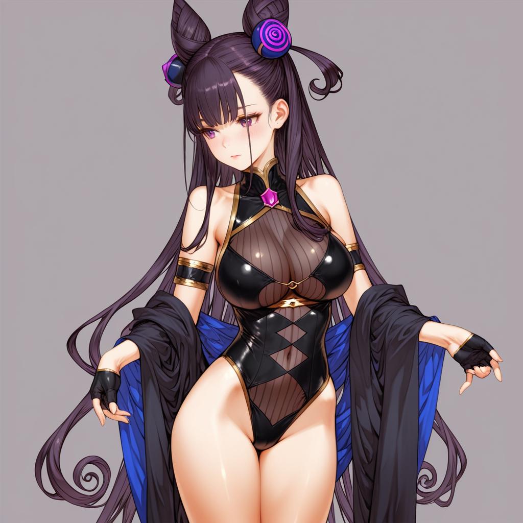 Murasaki shikibu (swimsuit rider) (first ascension) (fate), fate/grand order, 1girl, purple eyes, long hair, purple hair, tied hair, black hair, hair flower, large breasts, thighs, covered navel, black one-piece swimsuit, highleg swimsuit, half gloves, fingerless gloves, black gloves, bare shoulders, gold trim, armlet, shawl, by artist branch (blackrabbits), dark_illustrious