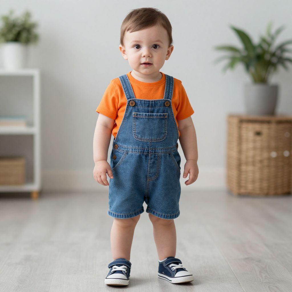 Baby organic coming home, solo, overalls, 1boy, male focus, shoes, indoors, realistic, looking at viewer, brown hair, sneakers, standing, full body, blurry, orange shirt, shirt