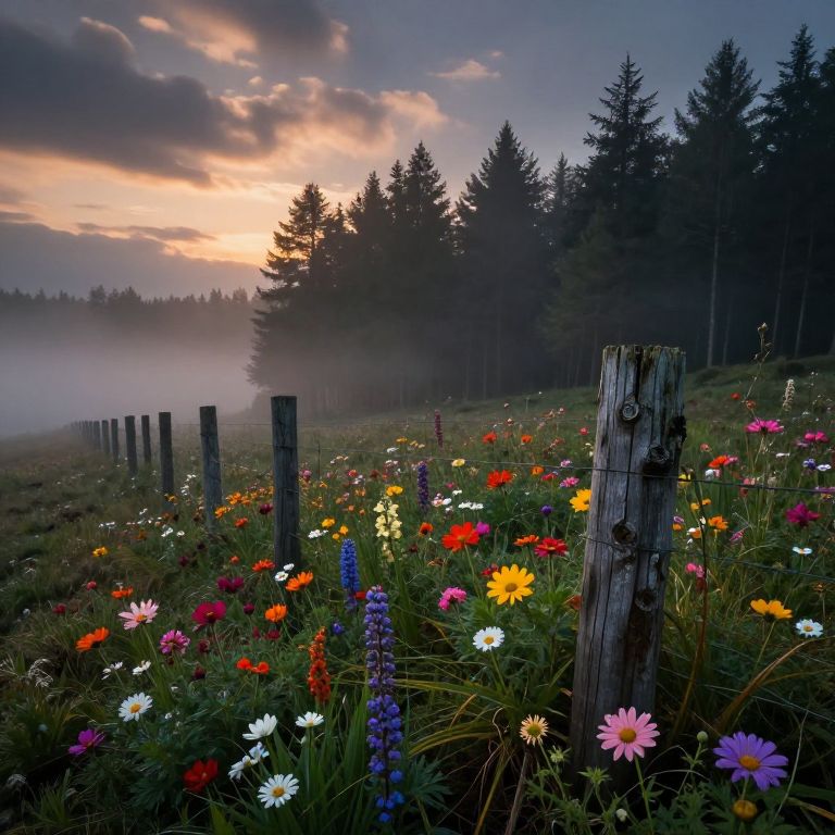 Reality dusk, high resolution, extremely detailed, evening, beautiful forest with fenceposts, colorful flowers, photorealistic, high detail, high definition, fog, clouds, volumetric lighting,