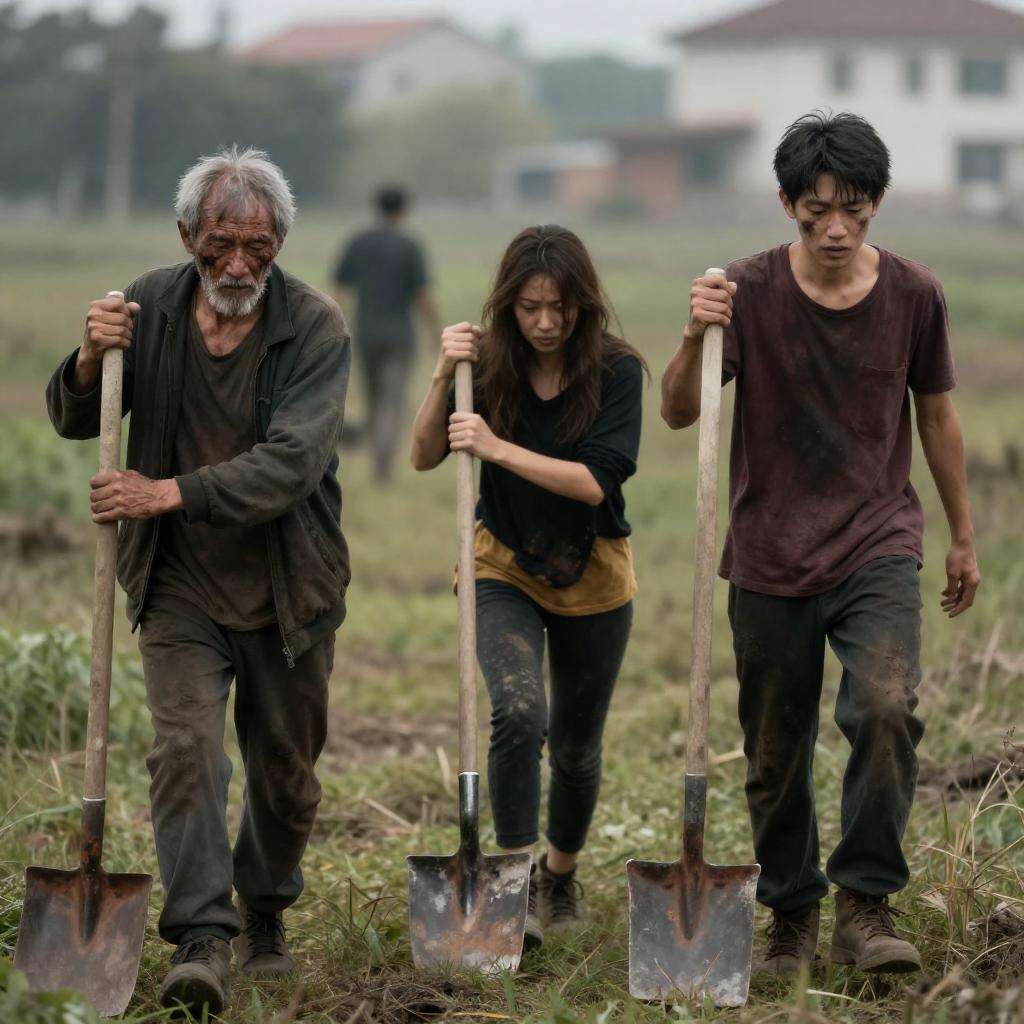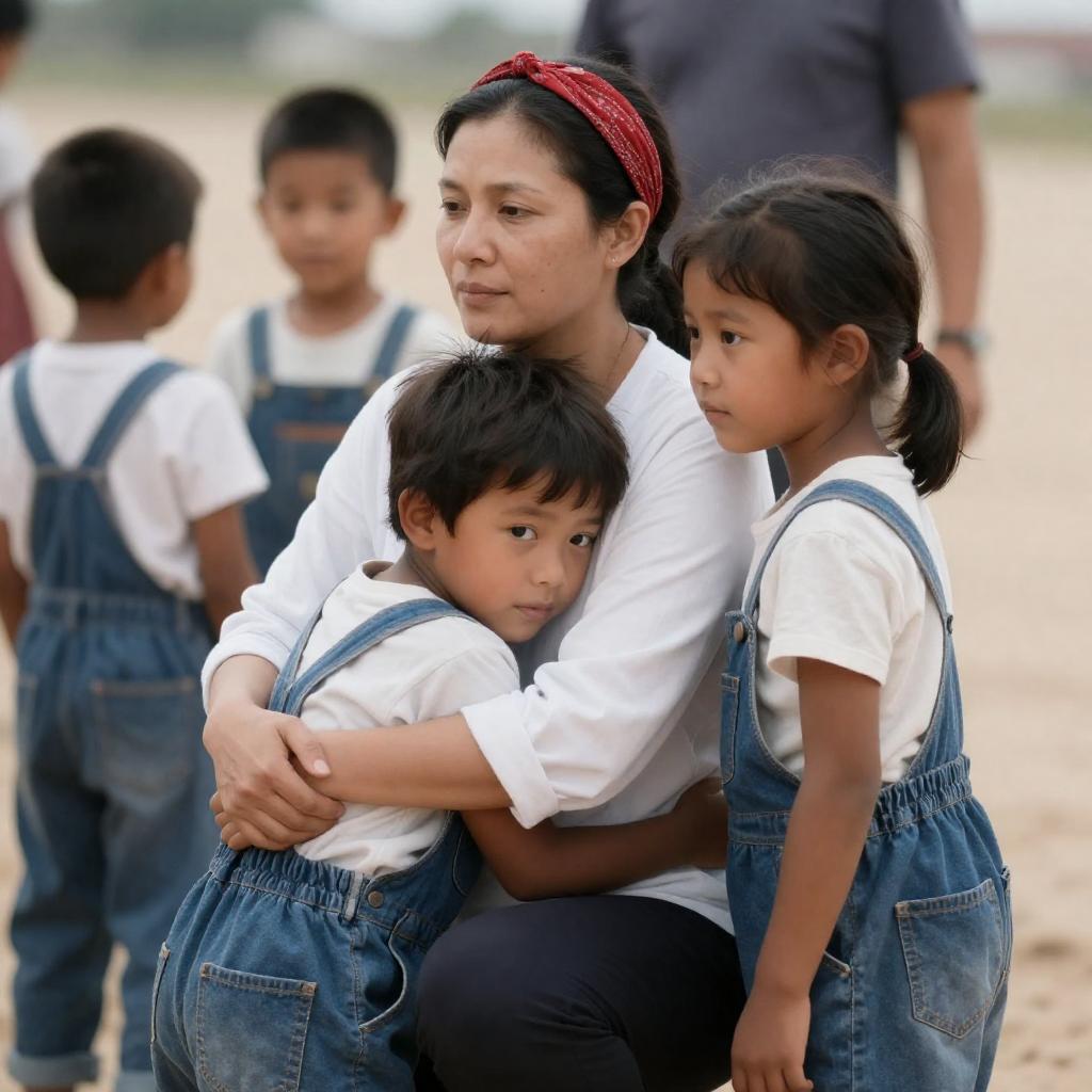 Photograph of two children walking away on a rusty, overgrown train track through an abandoned industrial site. Red, weathered wooden doors frame the foreground. Children wear worn clothes and backpacks. Industrial buildings, metal structures, and cloudy sky in background.