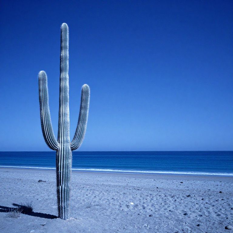 A moonlit desert landscape defies convention as its silvery-blue cacti stand serenely beside a tranquil ocean, where the boundary between land and sea dissolves into a dreamlike harmony under a star-studded sky.