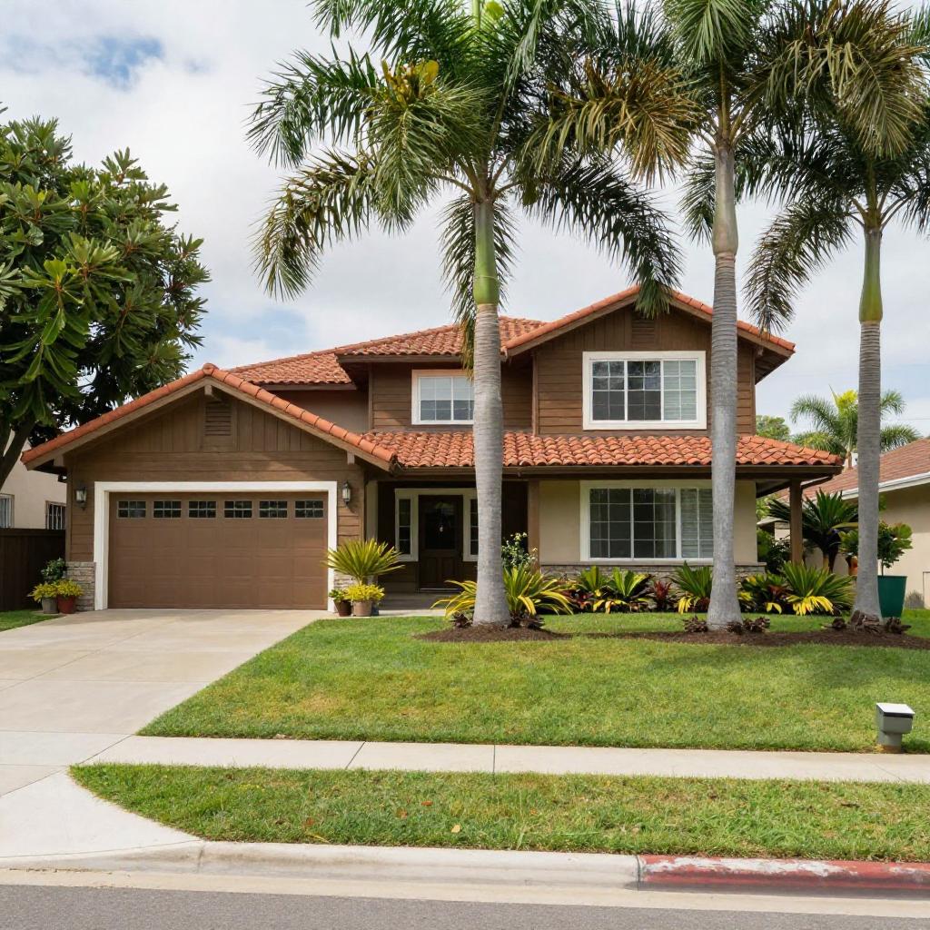 Photograph of a suburban house with a two-story wooden structure, surrounded by lush greenery. The image is taken from a slightly low angle, capturing the front yard with well-manicured grass and several tall palm trees. The house has a red-tiled roof and large windows. Bright, natural daylight illuminates the scene. The background, including the house, is in focus, with a moderate depth of field.