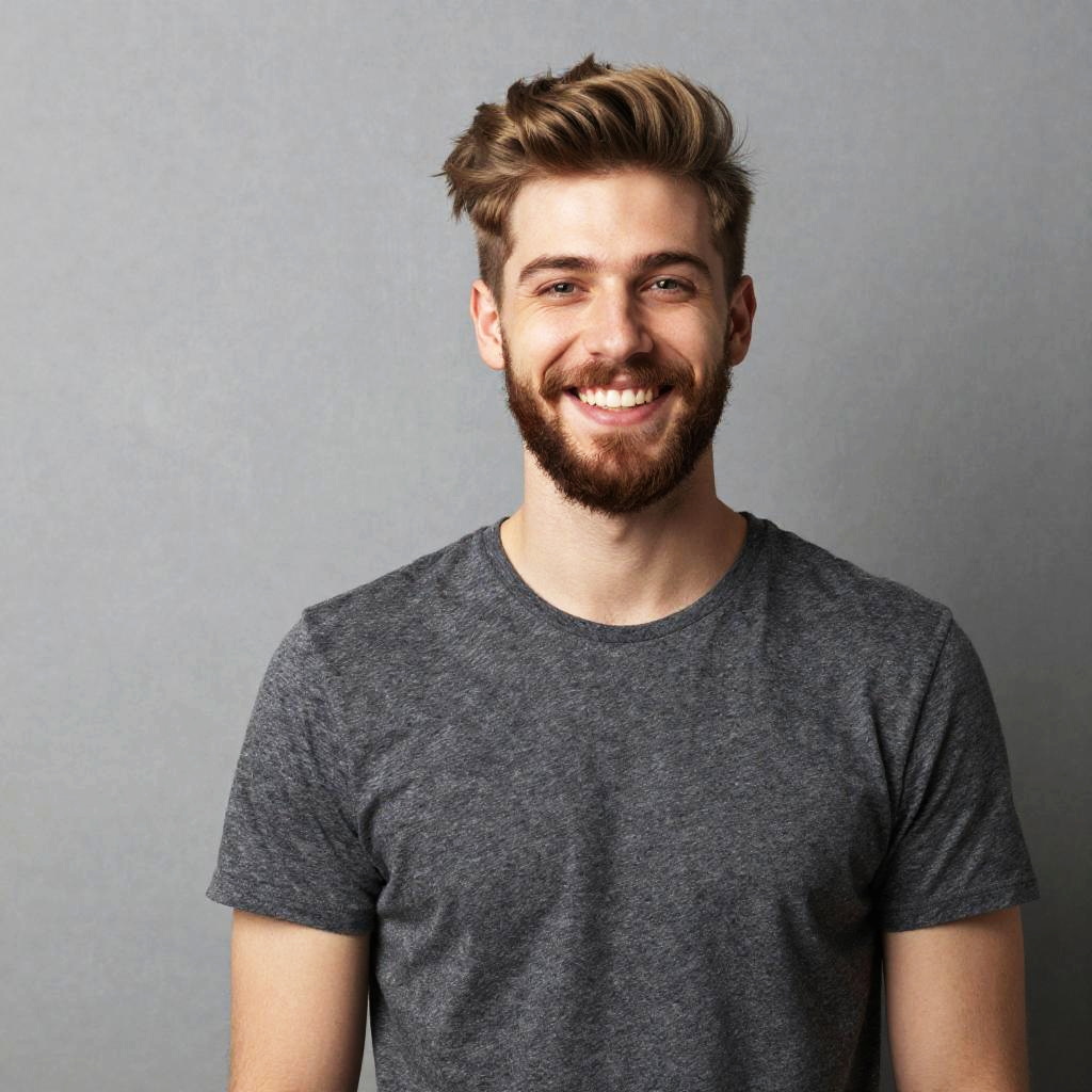 A smiling young man with a beard and styled hair poses against a textured gray background. His casual attire and confident expression convey a sense of approachability and friendliness, making this image ideal for personal branding or lifestyle content.