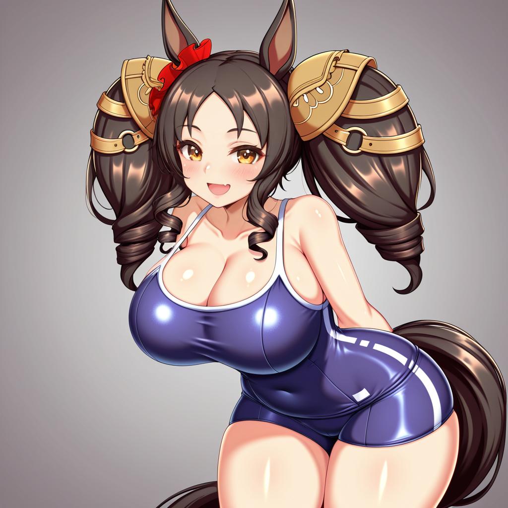 Masterpiece, best quality, highres, tailzkim, marvelous sunday \(umamusume\), + +, 1girl, :d, animal ears, arms behind back, blush, breasts, brown hair, cleavage, cowboy shot, drill hair, fang, horse ears, horse girl, horse tail, huge breasts, orange eyes, plump, saddle hair ornament, side drill, skin fang, smile, solo, tail, thick thighs, thighs, tracen swimsuit, twintails, wide hips(thick thighs, wide hips, ass visible from front, gigantic ass