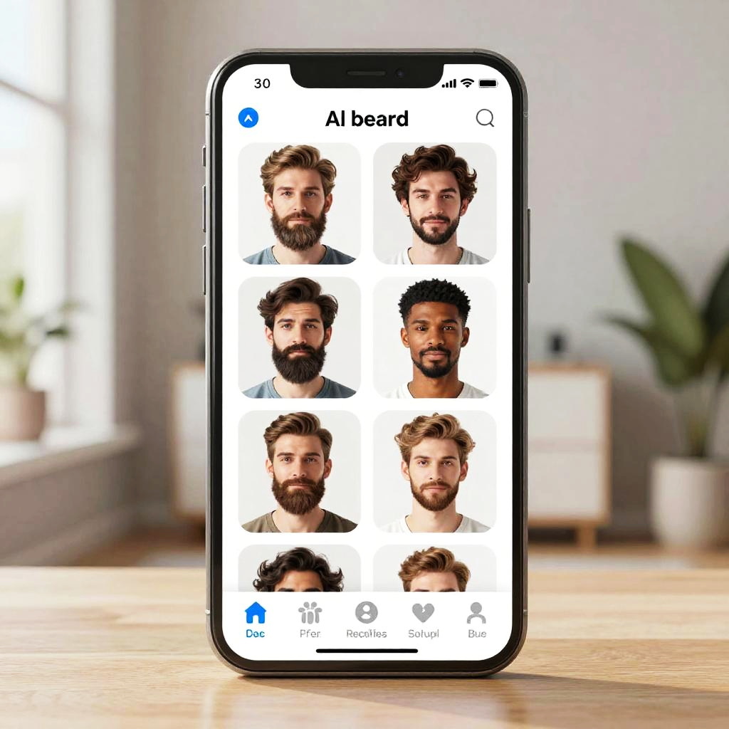 AI beard generator free visualization of an app on smartphone, showing multiple beard styles previewed in real-time, sleek modern design, light user interface, diverse ethnicity models, bright daylight indoor setting, photo-realistic rendering