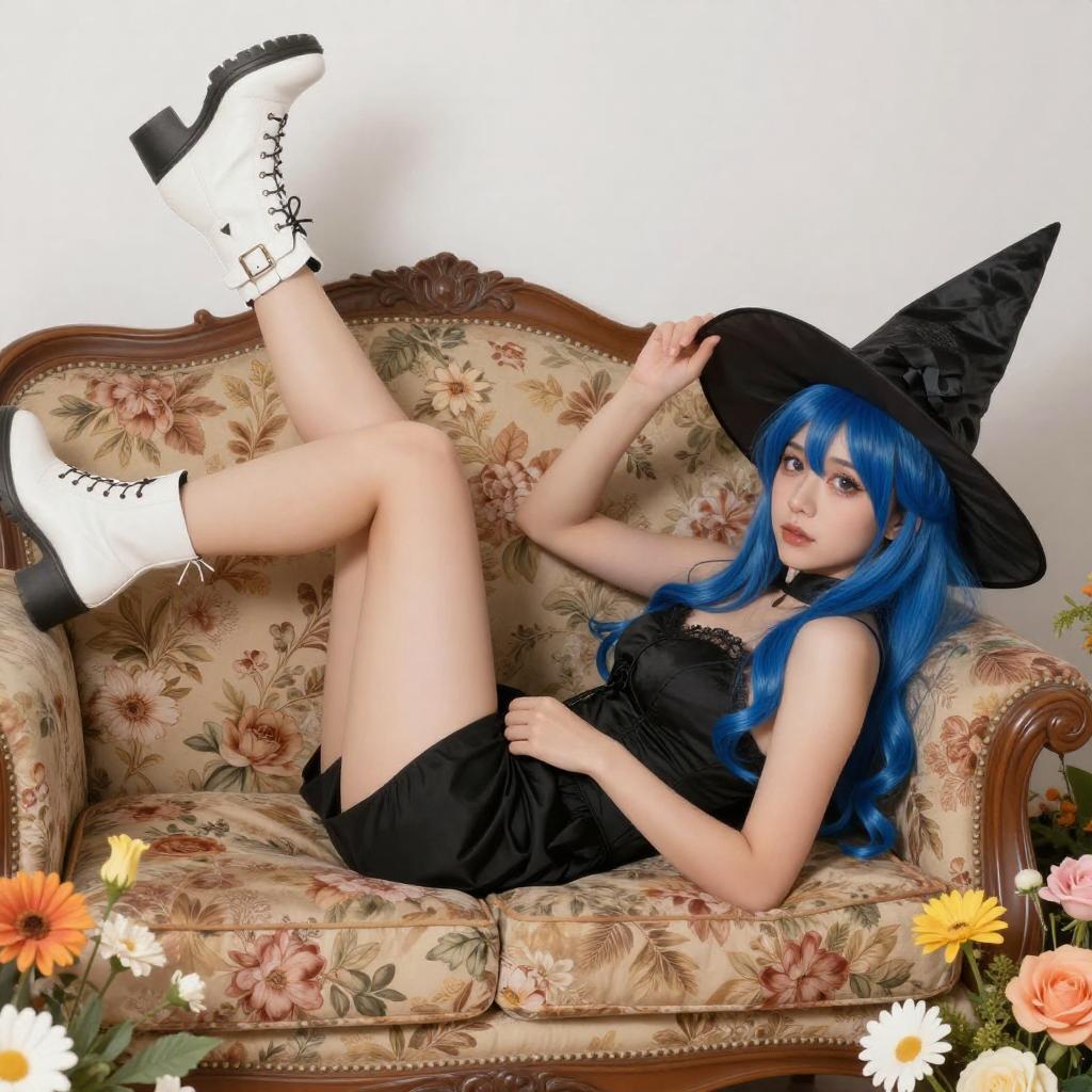 A digital artwork of a nude woman with blue hair and a black witch hat, lying on a floral-patterned couch. She wears white boots with black buckles and holds her hat. Her legs are bent, and she gazes at the viewer with a playful expression. Bright, colorful flowers surround her.