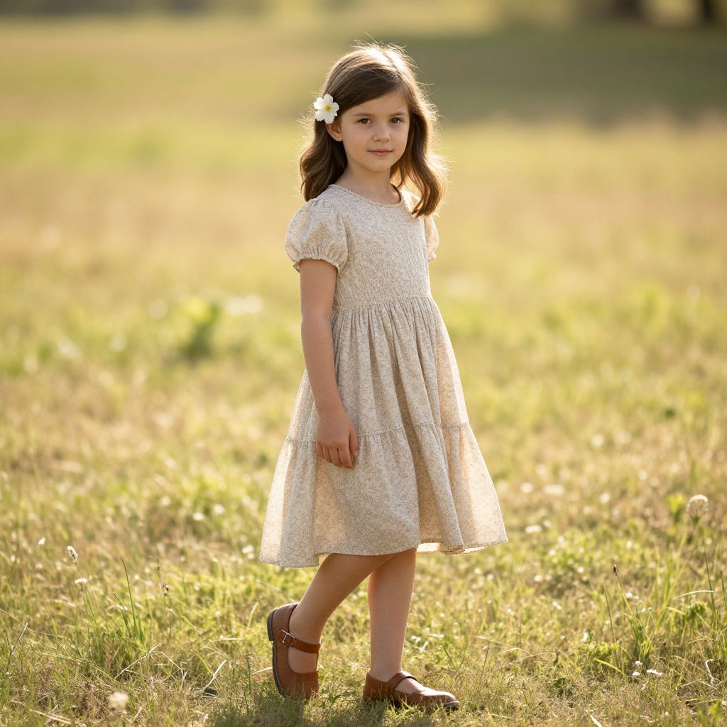 A beautiful young girl with soft brown hair, a few strands gently falling over her shoulders, and a delicate white flower nestled in her hair, adding a natural and serene touch. She is wearing a light beige dress with a subtle floral pattern that flows beautifully with her movement, and pair of classic brown shoes that complement her overall elegant and peaceful look. She stands in a sunny meadow, the golden light casting soft shadows, exuding calmness and natural charm.