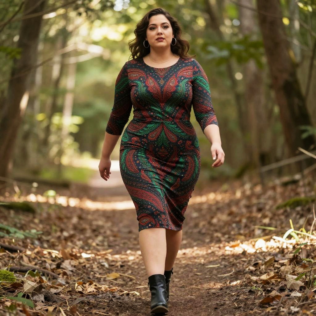 A Plus-size woman in a hakusensha style, wearing a fitted midi dress with a dark base and vibrant paisley patterns in red and green, round neckline, and three-quarter sleeves, paired with black ankle boots, walking along a forest trail with sunlight rays filtering through the trees. Sexy. Pretty face and beutiful eyes