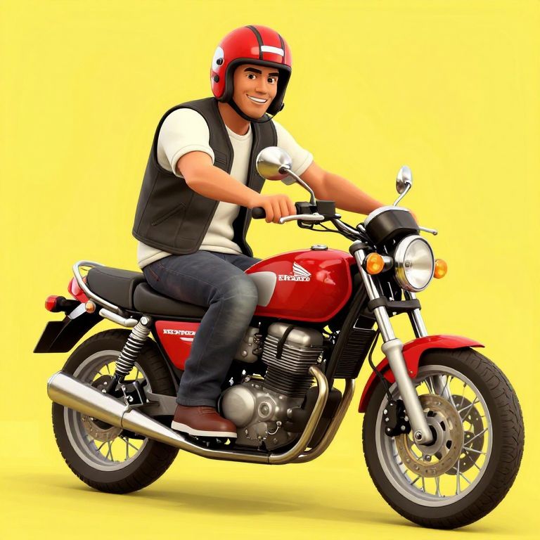 Traffic Flow a character from the GTA biker game using all the safety equipment to ride alongside his Honda CG motorcycle, smiling, hang loose, 3d gta game, yellow background,