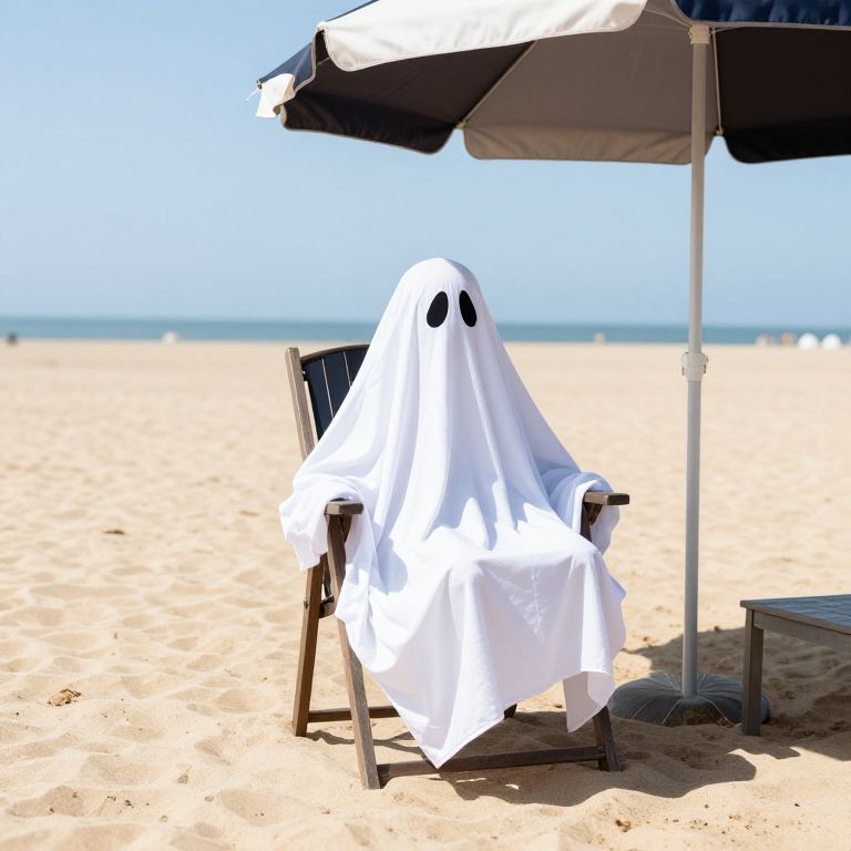 Photograph of a white ghost costume with black eye holes, sitting on a beach chair under a black-and-white umbrella. Sandy beach in the background with