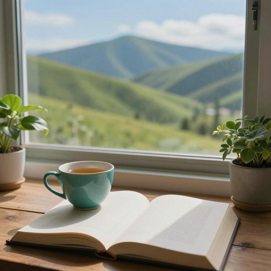 A peaceful indoor setting featuring a large window with a scenic view of rolling green hills and distant mountains under a clear blue sky. The foreground includes an open book with a teal cup of tea resting on it, surrounded by vibrant green houseplants, creating a calm and relaxing atmosphere ideal for reading or enjoying a quiet moment.