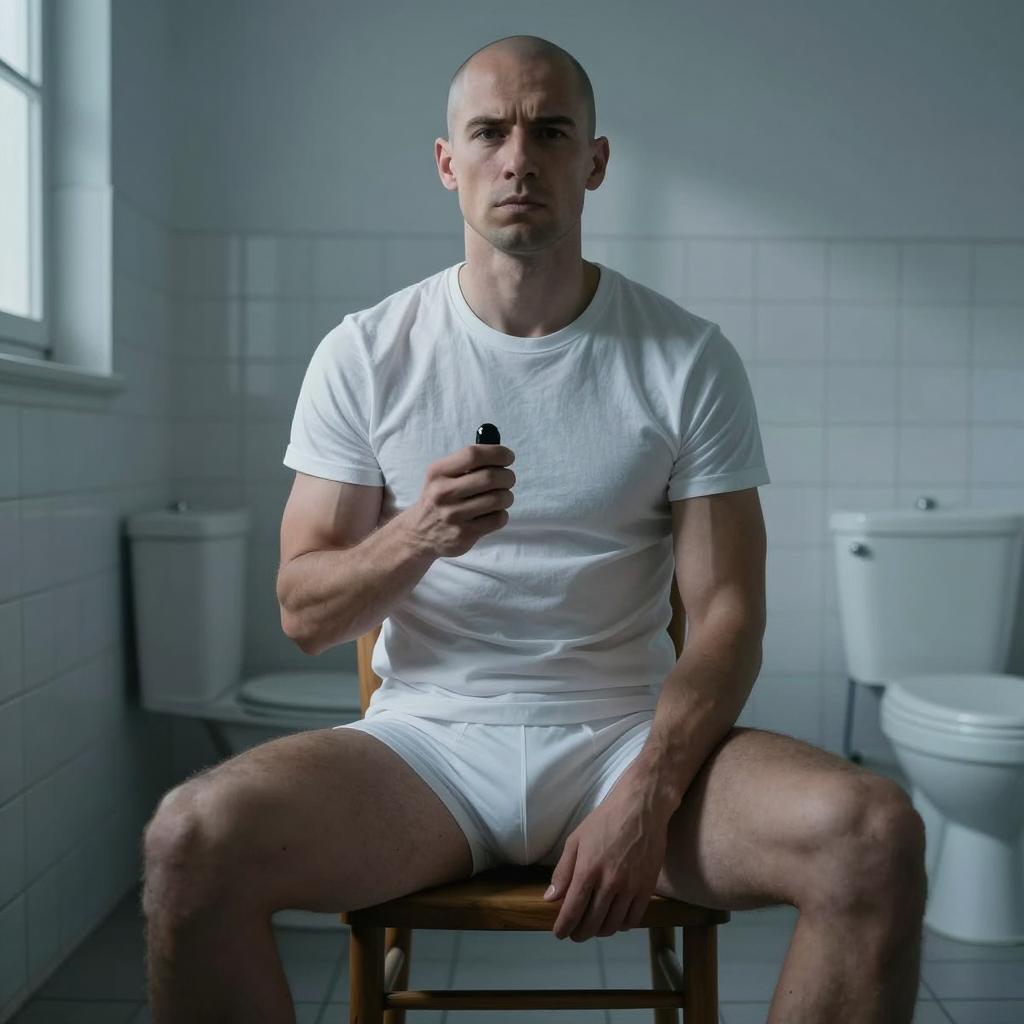 A bald man with a muscular build sits in a dimly lit bathroom, wearing a white t-shirt and white underwear. He holds a black object in his right hand, looking directly at the camera with a serious expression. The bathroom has white tiled walls, a toilet, and a window casting blue shadows. Two white toilets are in the background. The man sits on a wooden chair. The lighting is blue, creating a cool tone.