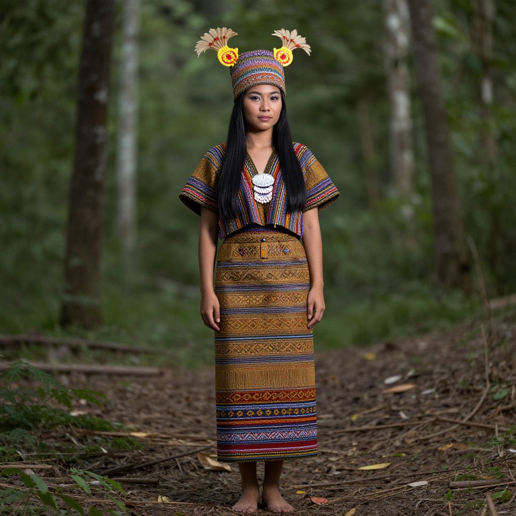 Modern Filipino Tribal Costume, woman in native dress standing in a forest