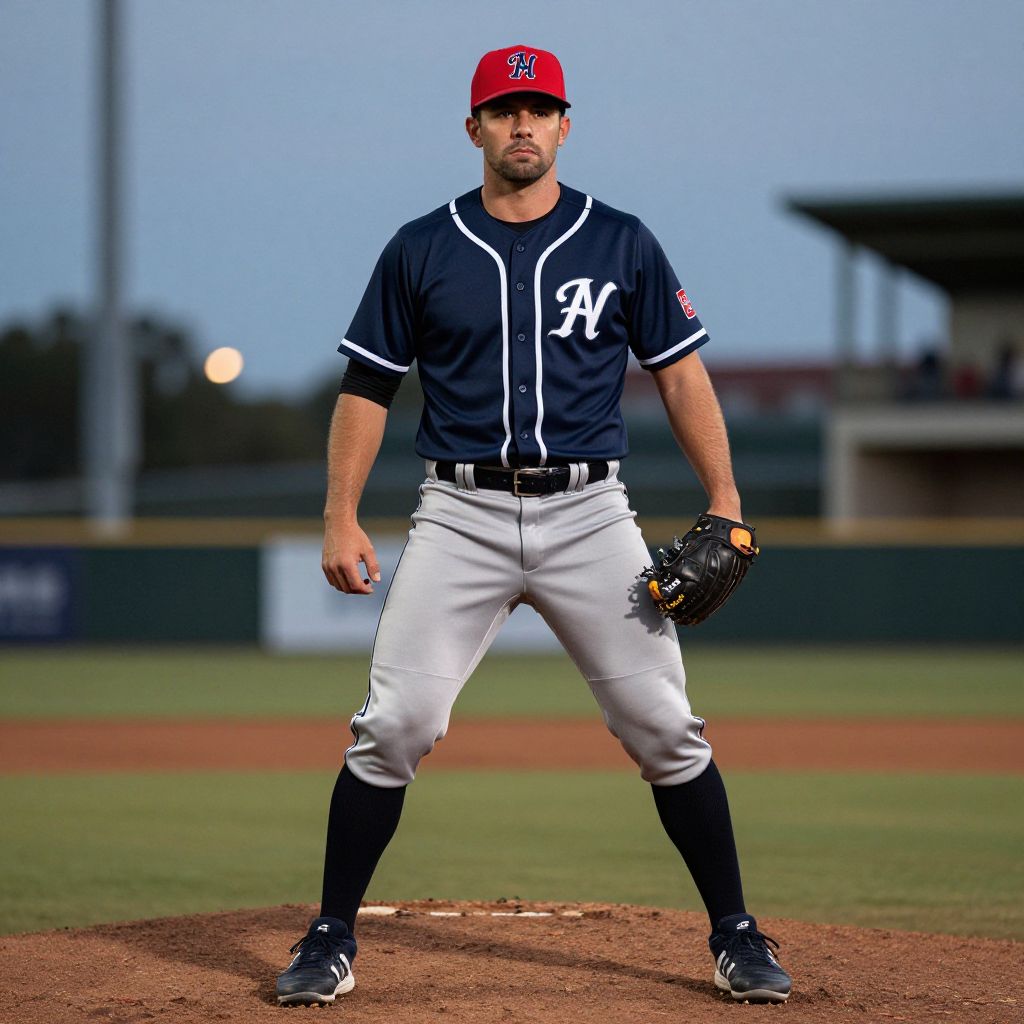 Photograph of a male baseball player standing on a pitcher's mound at dusk. He wears a navy blue jersey with white piping and an 'A' logo, white pants with a black belt, and a red cap with a white 'A' logo. He has a black glove on his left hand, dark blue socks, and black cleats. His stance is wide, with arms slightly bent. The background shows a blurred field, stadium lights, and a darkening blue sky. The image has a slight vignette effect, focusing attention on the player.