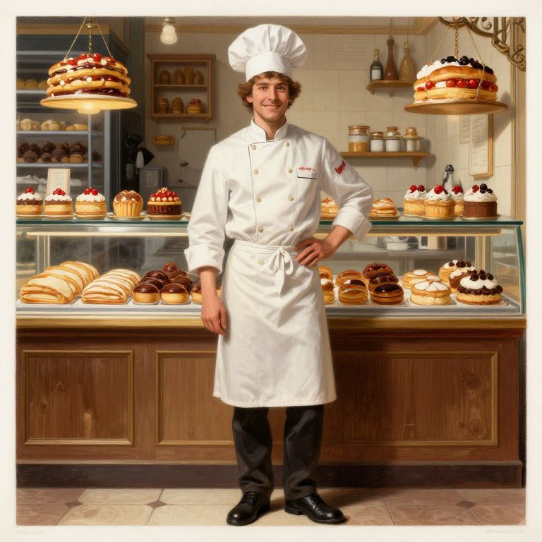 Photograph of a young male baker standing in a cozy bakery. He has light skin, brown wavy hair, and a slight smile. He wears a traditional white chef's coat with a name tag, white chef's hat, black trousers, and black shoes. The wooden counter behind him displays an array of colorful pastries, including cupcakes with cherries, donuts, and assorted bread rolls. Two hanging cake displays are visible above the counter, and shelves with baking supplies are in the background. The bakery has a warm, inviting atmosphere with soft lighting and wooden accents.