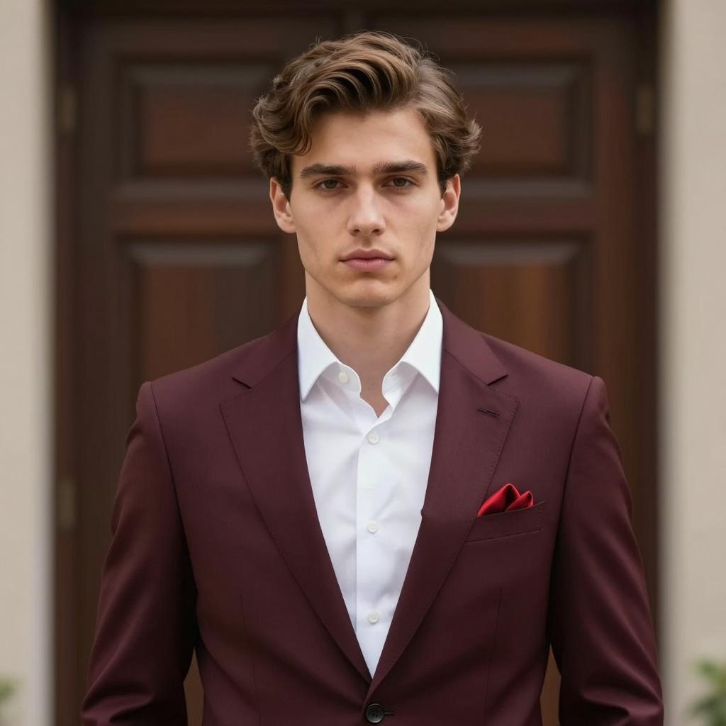 Wearing suit costume, photorealistic portrait of a handsome young man with brown hair, styled neatly, wearing a black suit, black dress shirt, and black tie with thin red stripes, serious expression, natural light, slightly blurred background, upper body shot, realistic ure, sharp details, formal attire, medium shot, professional look