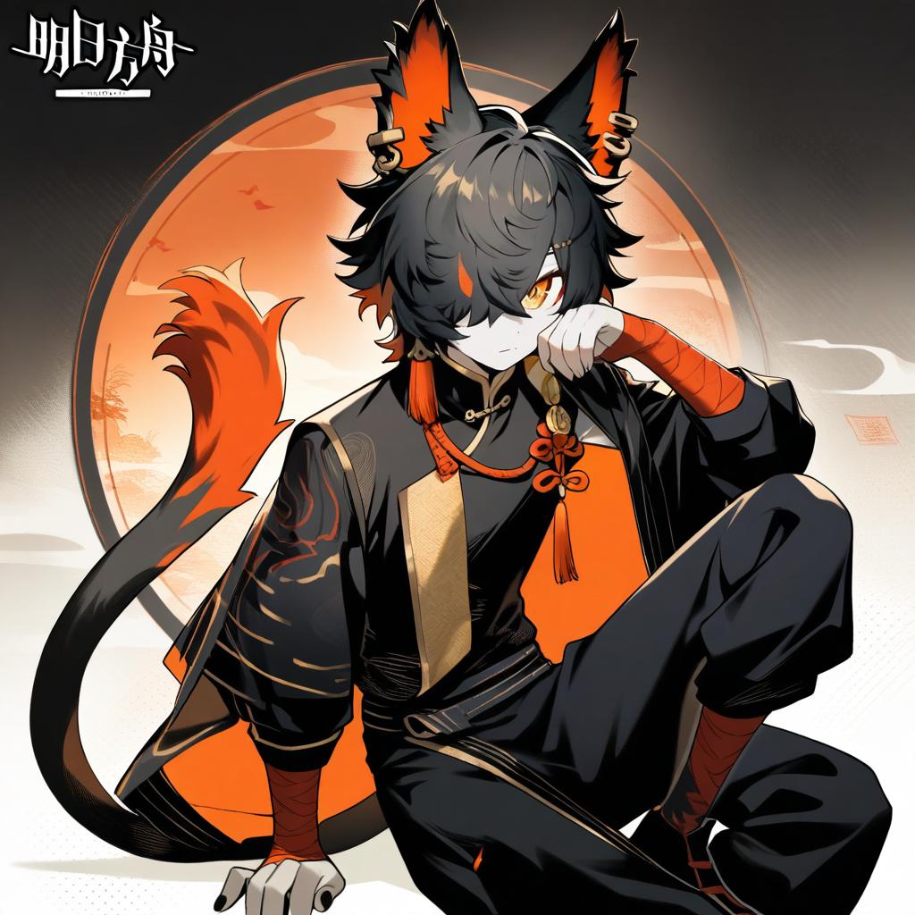 Aak (arknights), arknights, 1boy, furry male, cat boy, cat ears, ear piercing, tail, animal ears, yellow eyes, slit pupils, hair over one eye, black hair, short hair, chinese clothes, black nails, yellow sclera, by artist takunomi, animagine