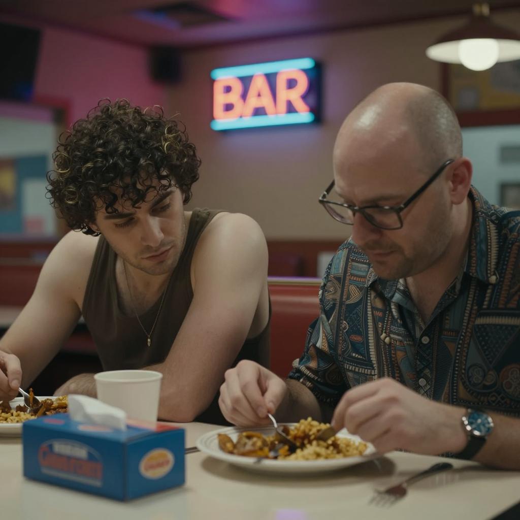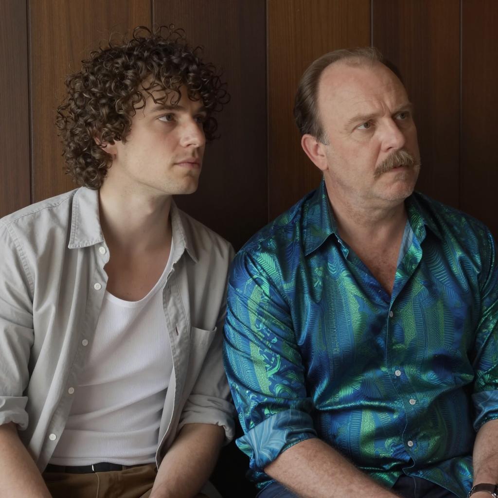 Two men sitting close together. The man on the left has curly brown hair, a light gray shirt, and a white tank top. The man on the right has a receding hairline, mustache, and wears a shiny blue and green patterned shirt. Both look to the left. Dark wooden background. The left man leans slightly forward, while the right man sits straight.