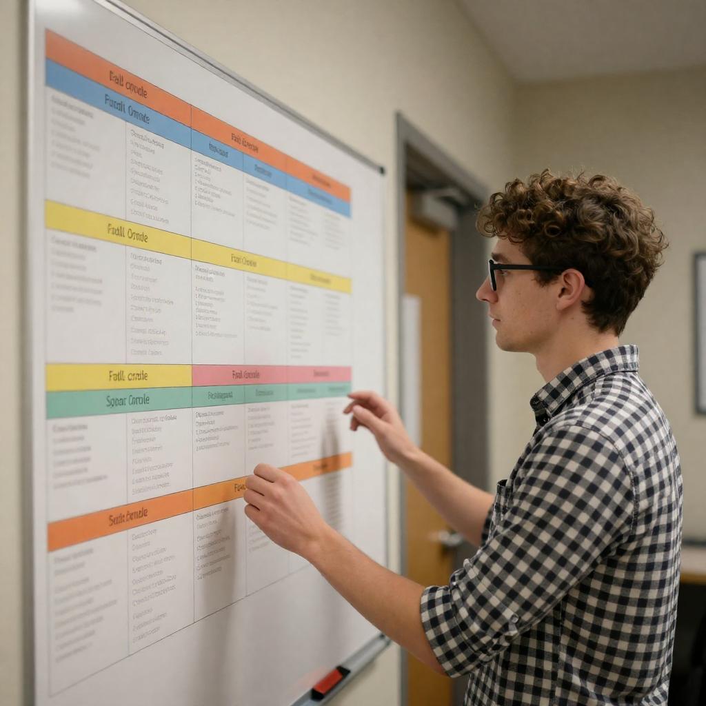 Photograph of a young man with curly brown hair and glasses, wearing a black and white checkered shirt, standing to the right and looking at a large, detailed fall schedule chart on a whiteboard. The chart is colorful with various categories and events. The man's hands are slightly raised, and he appears focused. The background includes a dimly lit room with a door and a wall.