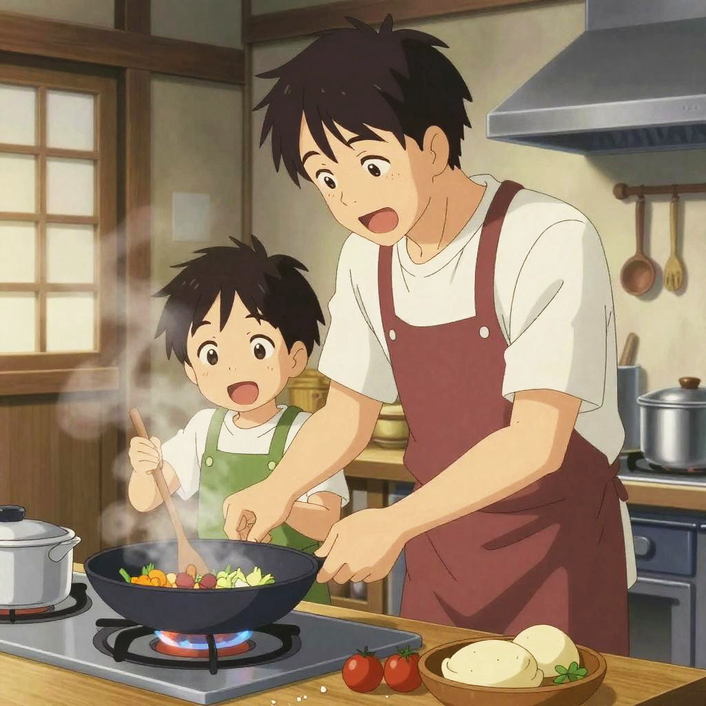Anime father and son sharing a heartfelt moment in a cozy living room, warm lighting, detailed expressions, soft background, emotional and tender scene, vibrant colors