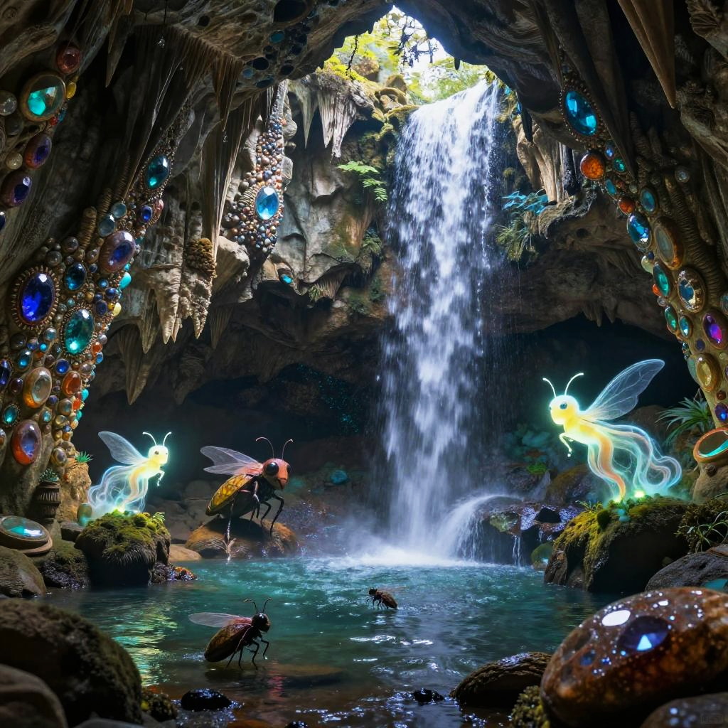 Caverna depicted as a mystical cavern with shimmering gemstones embedded in walls, underground waterfall cascading into a lagoon, fantasy creatures like glowing insects and ethereal spirits floating, magical realism style, vibrant colors and intricate details.