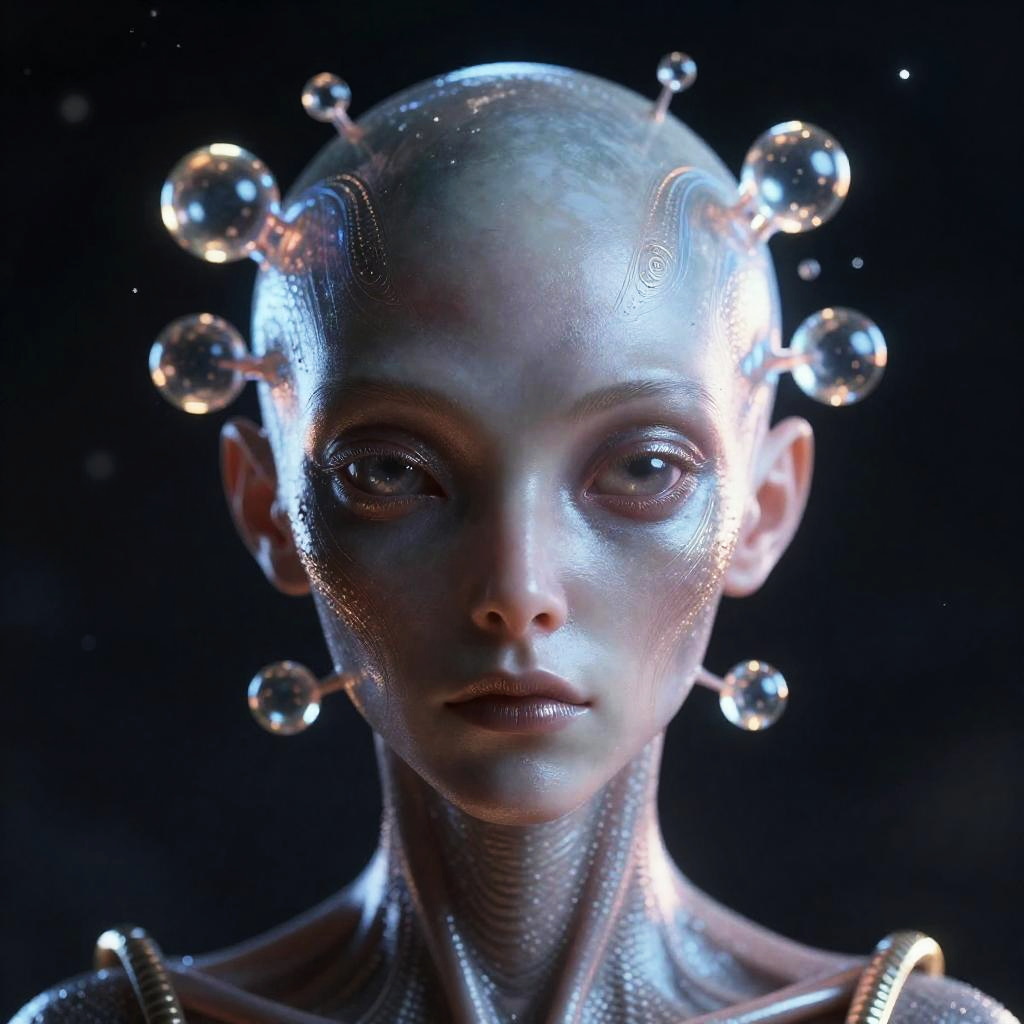 Realistic photo.Cyberpunk horror portrait of an eerie entity with a glassy stare, featuring pulsating veins visible beneath the skin. The artwork includes accent lighting, pale yellow sunlight, lasers, and a highly detailed mid-view composition, rendered with GLSL-shaders and advanced post-production effects. realistic photo