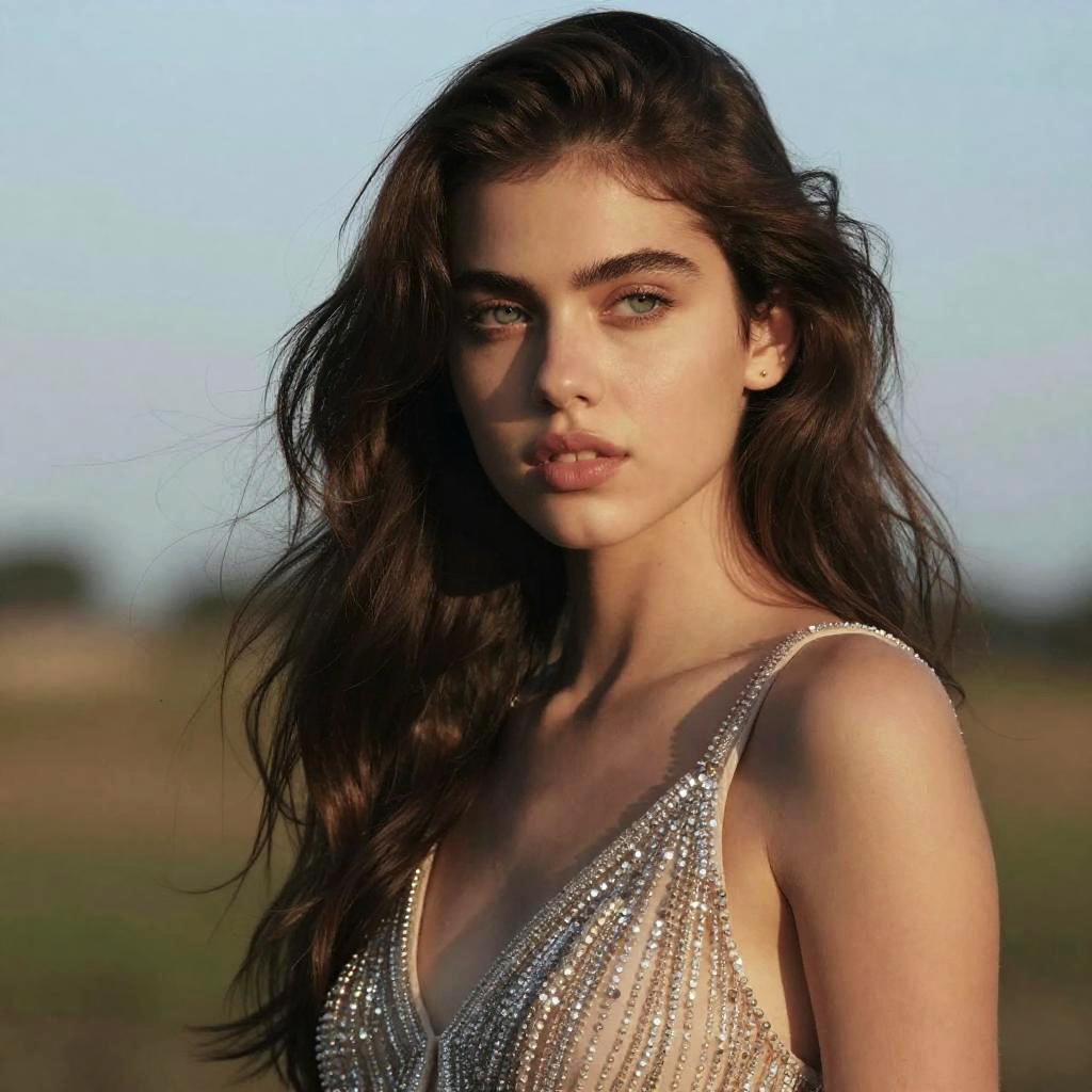 Photograph of a beautiful young woman with fair skin and long, flowing dark brown hair. She has striking green eyes and full, slightly parted lips. She's wearing a sparkling, beaded top that catches the light. The background is softly blurred with a hint of blue sky and distant landscape, giving a dreamy, ethereal feel. Her expression is calm and slightly introspective.