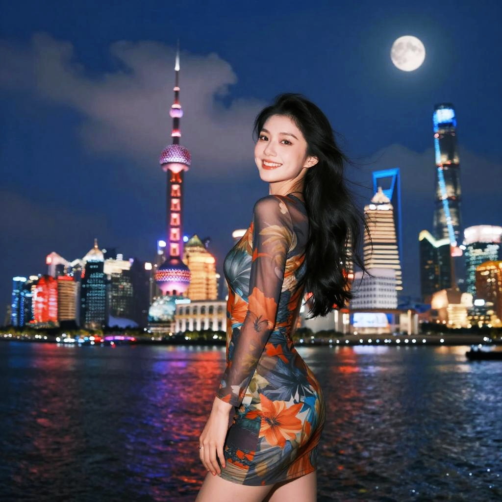 Realistic, photorealistic, masterpiece, best quality, dark shot, 1girl, solo, smile, looking at viewer, long black hair, ([:see-through:4]:1.2) cns_dress, standing by a river, dynamic pose, (china jiangnan water town style:1.1), water, colorful, incredible beautiful sky, netural lighting, dynamic Angle, vivid colors, neon, moon
