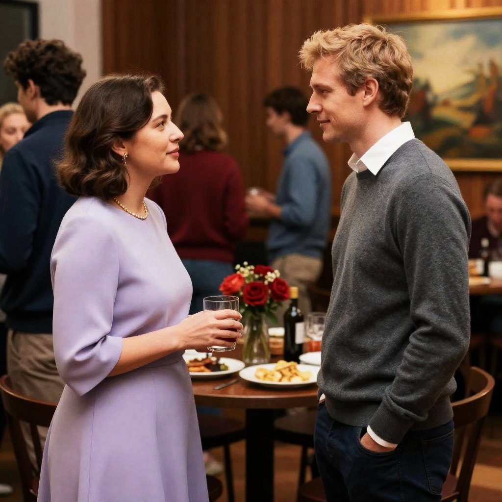 Photograph of a man and woman sitting on stone steps. The woman with pale skin, dark hair, and wearing a light blue dress with a beige coat draped over her lap. The man with light skin, blonde hair, in a cream suit, black tie, and holding a white hat. Man looks at woman; woman has intense expression. Both sitting close, man on left, woman on right. Stone steps and ured stone wall in background.