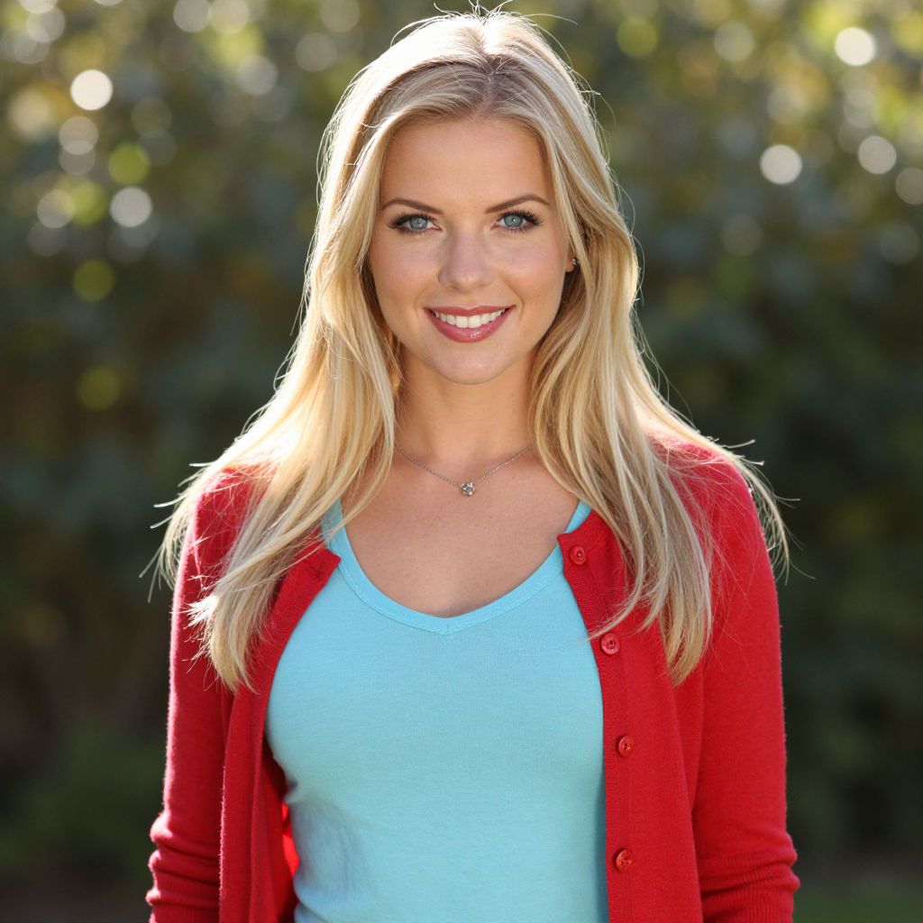 Photograph of a smiling blonde woman with long, wavy hair and blue eyes. She wears a bright red cardigan over a light blue V-neck top. Her complexion is fair, and she has minimal makeup with a natural look. She has a small, delicate necklace with a heart pendant. The background is blurred, featuring green foliage with sunlight filtering through, creating a bokeh effect. The overall lighting is bright, highlighting her hair and red cardigan. She stands facing the camera, exuding a friendly and approachable demeanor.