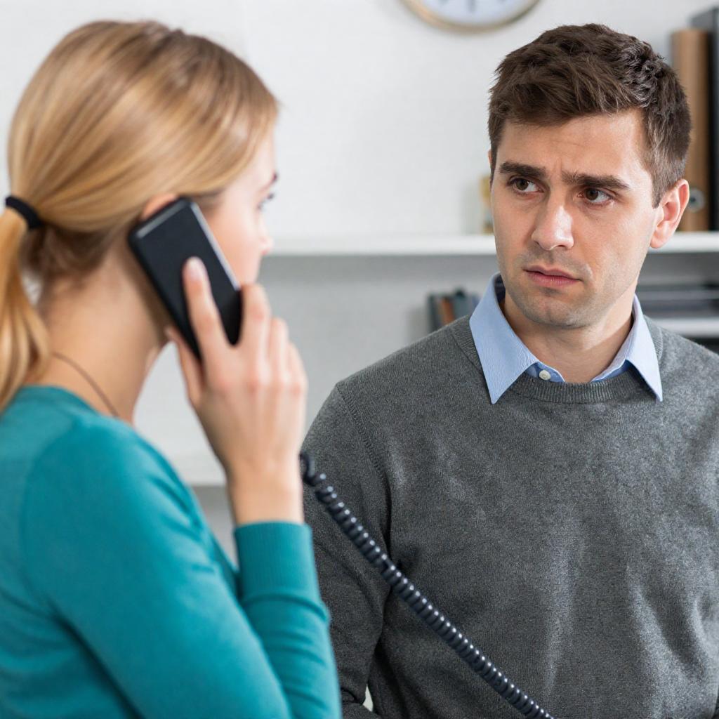 Indoor office scene with a blonde woman in teal sweater holding a black corded phone to the ear of a light-skinned man with short brown hair wearing a gray sweater over a light blue collared shirt. The man appears slightly concerned, while the background contains blurred office elements including shelves and a clock.