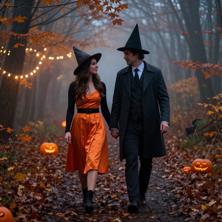 Intimate, dimly lit autumnal setting, a man dressed in festive attire, beaming with joy, surrounded by playful witches, glowing jack-o'-lanterns, and whimsical decorations, soft ambient light casting an enchanting ambiance, warm golden tones, mystical elements, inviting atmosphere, Halloween spirit. Man has masculine face and piercing eyes
