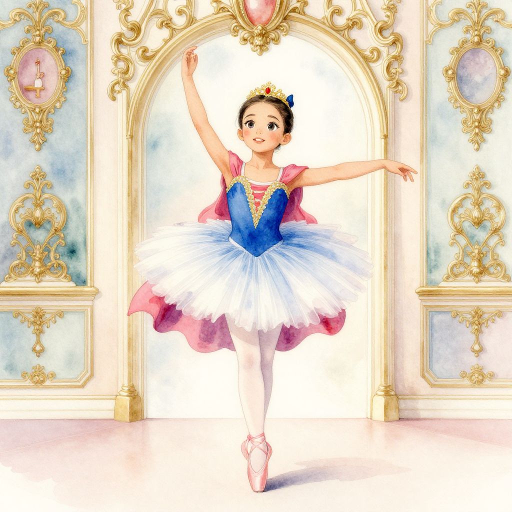 Digital illustration of a ballerina in a pink tutu and corset, white tights, and pink ballet shoes, shown from front, side