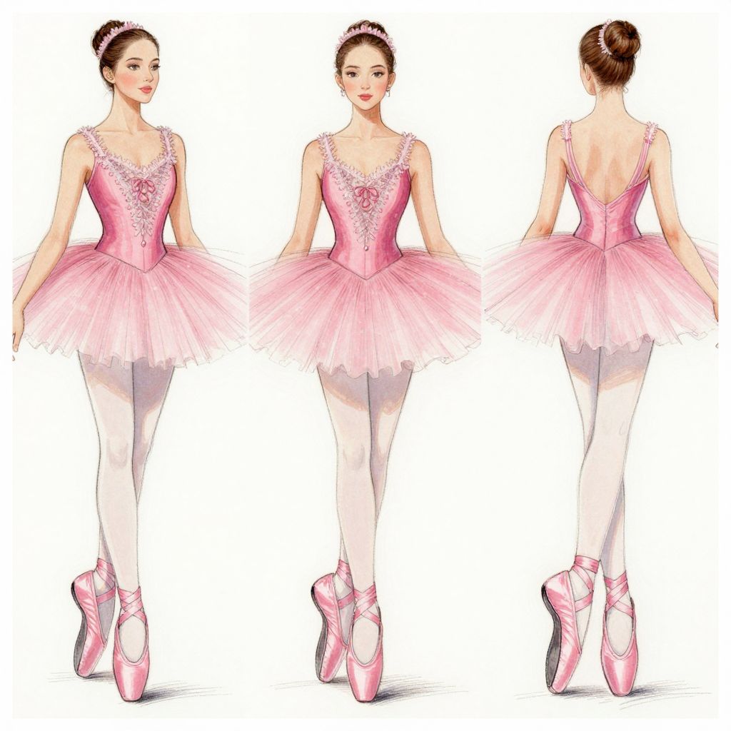 Digital drawing of a ballet dancer in three views: front, side, and back. The dancer has fair skin, dark brown hair in a bun, and is wearing a pink, intricately embroidered, sleeveless leotard with a deep V-back and a voluminous, pink tulle tutu. She has white tights and pink ballet pointe shoes with ribbons. The background is plain white, emphasizing the dancer's detailed costume and elegant pose. The drawing style is realistic with soft shading and detailed textures on the tutu and leotard.