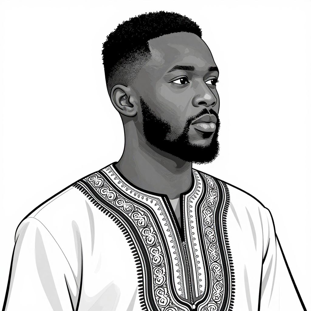 This digital illustration depicts a young Black man with a short, curly hairstyle and a trimmed mustache, wearing a simple black t-shirt. He is shown from the waist up, with his eyes closed and hands clasped together in a prayerful gesture. His dark skin contrasts with the bright, white background that features subtle, light streaks and a faint circular pattern. The man's expression is serene and focused. The art style is smooth and semi-realistic, with soft shading and clean lines, giving a modern and slightly abstract feel to the image.