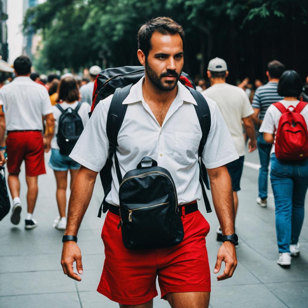 Salsa Performance Costume, man in white shirt and red shorts with backpack