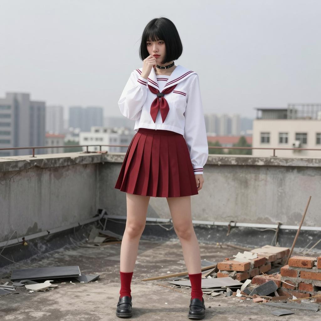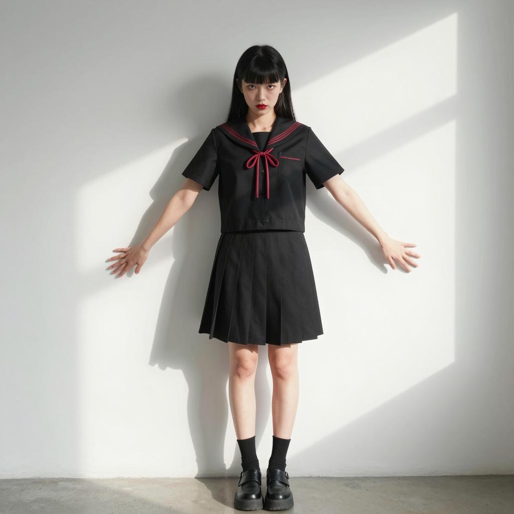 Photograph of an East Asian person with pale skin and black bob haircut. Wearing a black sheer sailor-style dress with a red bow, black pleated skirt, black socks, and black combat boots. Standing against a white wall with shadows. Right hand touching hair, left arm relaxed. Intense, slightly melancholic expression. Light coming from the left. ©-JAPAN in lower right corner.