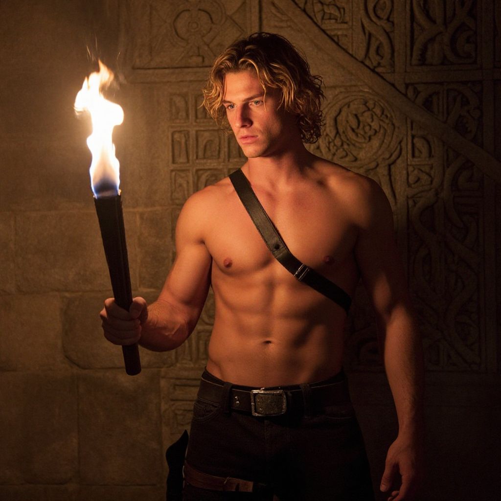 Photograph of a muscular, shirtless man with wavy blond hair standing in a dimly lit, ancient-looking stone room. He's holding a torch with a bright flame in his right hand, illuminating his defined abs and chest. He's wearing dark pants with a black strap crossing his chest and a belt with a silver buckle. The stone wall behind him is carved with intricate patterns. The lighting casts a warm, dramatic glow on his body.