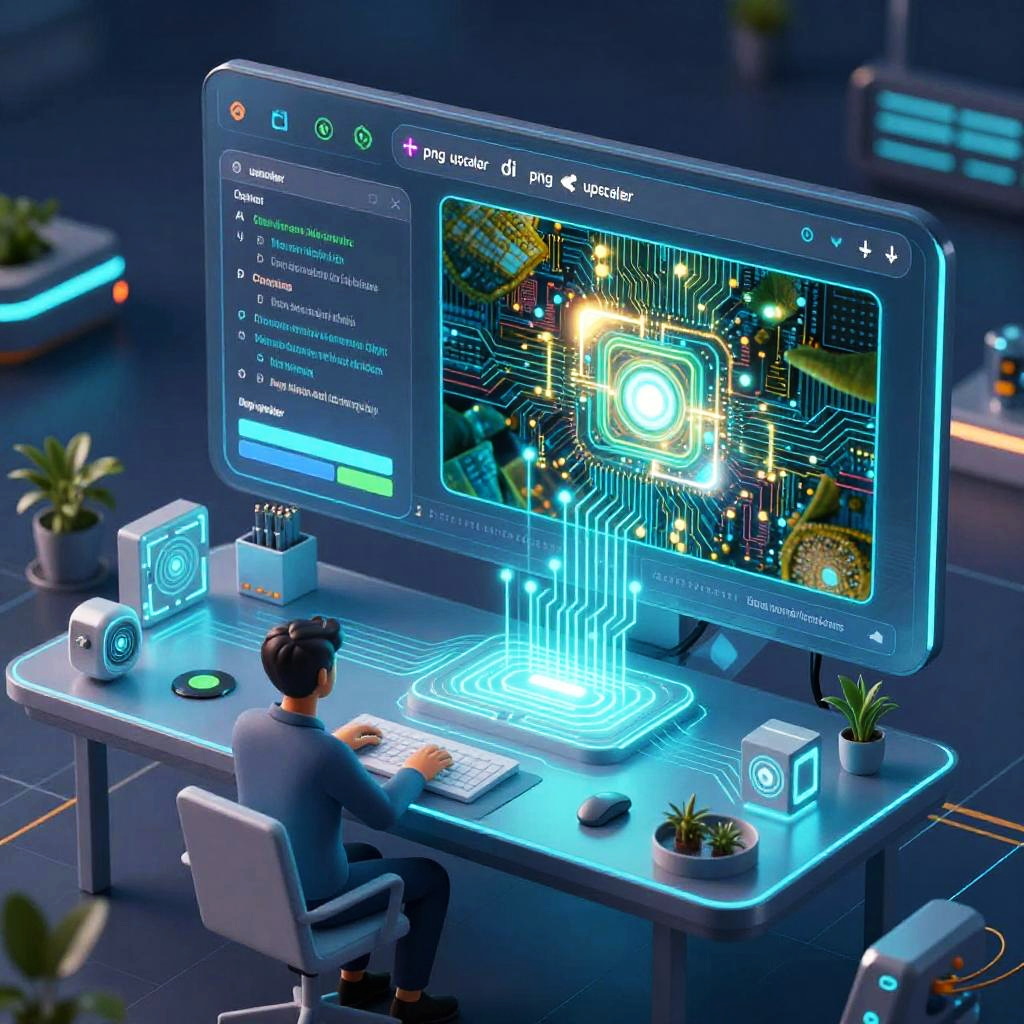 Png upscaler interface showing a futuristic digital workspace, vibrant glowing elements, circuit board textures, AI algorithms enhancing image quality in real-time, neon blues and greens, ultra detailed, high-tech visualization