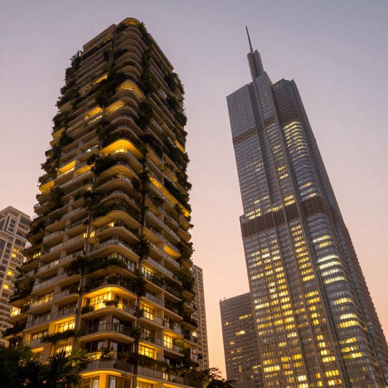 Towering skyscrapers stand majestically against a twilight sky, their balconies adorned with vibrant greenery and illuminated windows casting warm, golden glows that pierce through the soft haze, creating a surreal blend of nature and urban architecture.