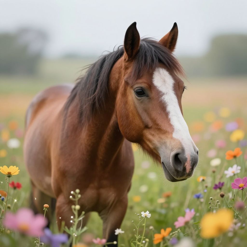 Photograph of a brown horse with a white blaze on its face standing in a vibrant, colorful meadow. The horse has a dark brown mane and stands slightly to the left, looking directly at the camera with a calm expression. The background is softly blurred, showcasing a field of wildflowers in various colors, including yellow, pink, and purple, under a bright, clear sky. The horse's coat is shiny and well-groomed, contrasting with the delicate textures of the surrounding flowers. The overall scene evokes a peaceful, natural setting.