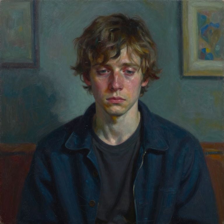 Realistic oil painting of a young man with wavy brown hair, pale skin, and sad expression, wearing a black shirt and jacket, against a