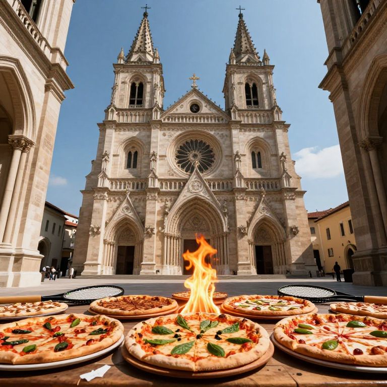 Ancient Church with Pizzas & Tennis Rackets