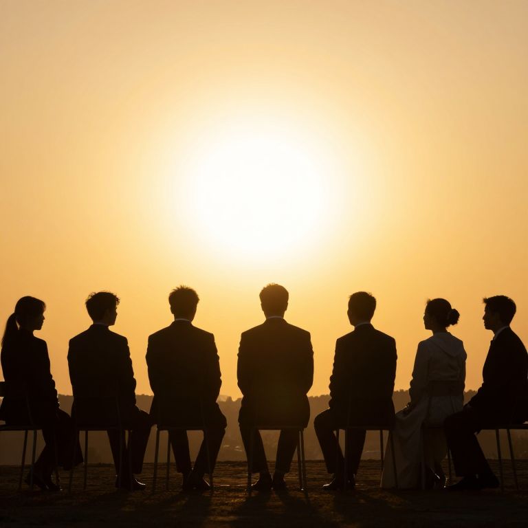 Photograph of seven silhouetted individuals, five men and two women, sitting in a row against a bright, orange sunset. The sun is centered in the background, casting a warm, glowing light. The people wear formal attire, including suits and dresses, and are seated on simple, dark chairs. The horizon is faintly visible at the bottom, with the sky transitioning from yellow to orange. The overall mood is serene and contemplative, with the strong backlight creating a stark contrast between the dark silhouettes and the vibrant sky.